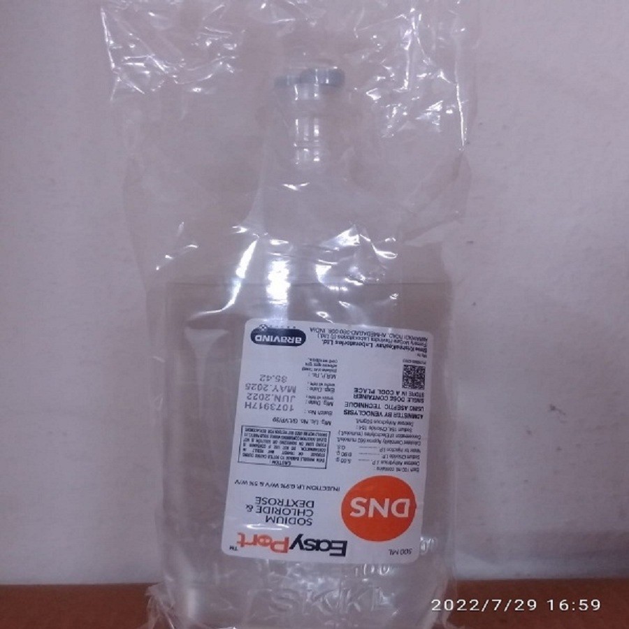 Dns Bottle Injection 500 ml contains sodium chloride and dextrose solution. It works by restoring body fluid and electrolytes lost during trauma, surgery, or dehydration.